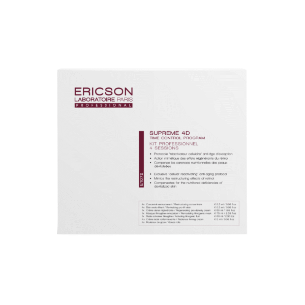 SUPREME 4D -linjan myötä ERICSON LABORATOIRE tarjoaa poikkeuksellisen uudistavan ihonhoitokokonaisuuden, joka vaikuttaa samanaikaisesti ihon ikääntymisen neljään ulottuvuuteen: kudostiheyden heikkenemiseen, ihon veltostumiseen, värimuutoksiin sekä hydrolipidikalvon krooniseen heikentymiseen. Koostumukset sisältävät “solujen aktivoija” -kompleksin, joka on kehitetty jäljittelemään retinolin uudistavia vaikutuksia ja korvaamaan kypsän ihon rakenteellisia puutteita. SUPREME 4D palauttaa kasvoille nuorekkaan heleyden ja elinvoiman.
